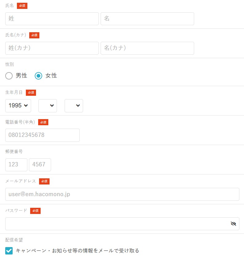 氏名、性別、生年月日、電話番号、郵便番号、メールアドレス、パスワードを入力して、【確認画面】ボタンを押します。