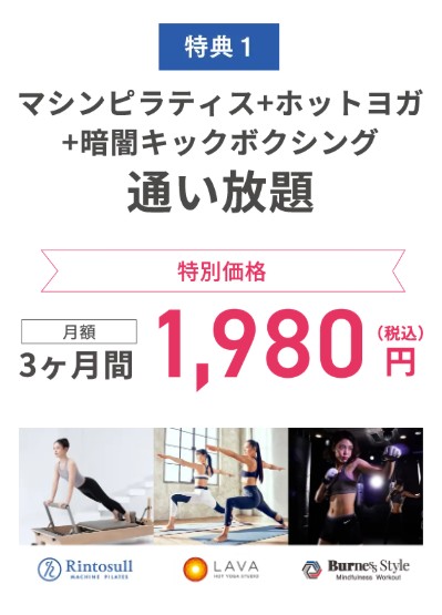 Rintosull(リントスル) | 0円 | 18,800円(税込) 全国のRintosull・ホットヨガスタジオLAVA・暗闇キックボクシングBurnesStyleの3ブランド通い放題 ※別途運営管理費 一律月480円 |