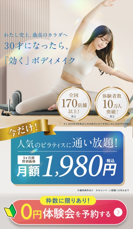 - マシンピラティススタジオ「リントスル」で5か月以内に体験会、見学会に参加またはリントスルかホットヨガスタジオLAVAにてマンスリー登録をしていない