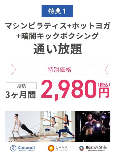 全国のRintosull・ホットヨガスタジオLAVA・暗闇キックボクシングBurnesStyleの3ブランド通い放題