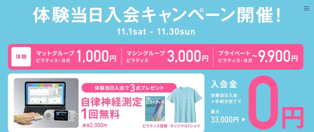 さらに、オリジナルTシャツやピラティスBOOK、トータルパワー測定キャンペーンがあります。